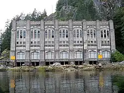 Buntzen No. 1 was built in 1903 by the Vancouver City Light and Power Company to provide electricity for the Vancouver area's streetcars. It used four 1,500 kW generators and by 1912 three additional 5,000 kW units were installed.[11] The north end of the original four unit powerhouse at Buntzen No. 1 was demolished in 1950 and a new building, a 55,000 kW unit 1 generator and a larger turbine were added in 1951.[12]