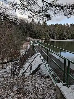 The reservoir was created to address the increasing demand for water in Chittenden County. A series of droughts in the early 20th century led the village of Essex Junction to procure land for water conservation. On June 29, 1955, Essex Junction purchased 501 acres of land from various owners.[1] In 1957, the village hired Knight Consulting Engineers, Inc. to build a dam across Indian Brook and flood the valley. The resulting impounded water formed a 58 acre reservoir and became the main source of water for the village. The land surrounding it was established as a water conservation area known as the Indian Brook Town Conservation Area.[2]