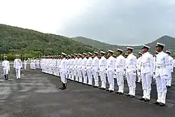 The Indian Naval Academy (INA or INA Ezhimala) is the defence service training establishment for officer cadre of the Indian Navy and the Indian Coast Guard, located in Ezhimala, Kannur district, Kerala. Situated between Ezhimala hill and the Kavvayi backwaters, INA has a 7 kilometre beach front on the Laccadive Sea. It conducts basic training for all officers inducted into the Indian Navy and Indian Coast Guard.[2] It is Asia's largest, and the world's third-largest, naval academy.[3][4][5]