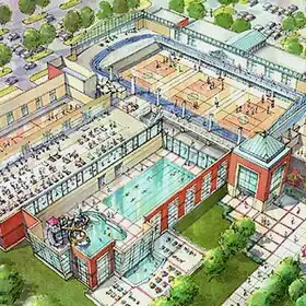 The rec center will include a three-court gymnasium and a multi-activity court with a durable surface suitable for such activities as soccer and roller hockey. Plans also call for a leisure aquatics facility, jogging track, climbing wall, fitness center, spinning room, two multi-purpose rooms, student lounge, juice bar, and outdoor recreation yard.