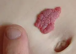 An infantile hemangioma (IH), sometimes called a strawberry mark due to appearance, is a type of benign vascular tumor or anomaly that affects babies.[1][2] Other names include capillary hemangioma,[6] "strawberry hemangioma",[7]: 593  strawberry birthmark[8] and strawberry nevus.[6] and formerly known as a cavernous hemangioma. They appear as a red or blue raised lesion on the skin.[3] Typically, they begin during the first four weeks of life,[9] growing until about five months of life,[10] and then shrinking in size and disappearing over the next few years.[1][2] Often skin changes remain after they shrink.[1][5] Complications may include pain, bleeding, ulcer formation, disfigurement, or heart failure.[1] It is the most common tumor of orbit and periorbital areas in childhood. It may occur in the skin, subcutaneous tissues and mucous membranes of oral cavities and lips as well as in extracutaneous locations including the liver and gastrointestinal tract.