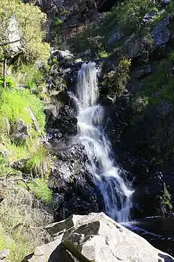 The waterfall is situated approximately 8.3 kilometres (5.2 mi) south of the town of Yankalilla and 70 kilometres (43 mi) south southwest of the state capital of Adelaide, the waterfalls descend from an elevation of 253 metres (830 ft) above sea level in the range of 81–92 metres (266–302 ft) to the Second Valley below.[2][4] Its name was approved on 25 May 2000 in response to "a request for clarification from the Royal Automobile Association on which name to use for the feature."[1]