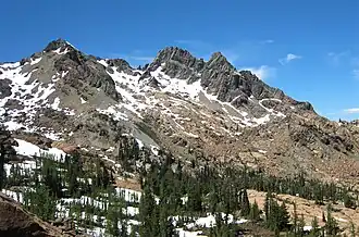Ingalls Peak is a 7,662-foot (2,335-metre) triple-summit mountain located in the Alpine Lakes Wilderness, along the common border of Kittitas County and Chelan County, in Washington state.[5] Ingalls Peak is the highest point in the Teanaway area of the Wenatchee Mountains.[1] It is situated 2 mi (3.2 km) west of Mount Stuart, and immediately west of Lake Ingalls, on land managed by Wenatchee National Forest. Its subpeaks are the South Peak (7,640 ft; 2,330 m) and the East Peak (7,480 ft; 2,280 m).[1] Precipitation runoff from the peak drains north into Jack Creek, a tributary of Icicle Creek; west into Fortune Creek; or east into Ingalls Creek, a tributary of the Wenatchee River. This peak, the lake, creek, and pass are named for Captain Benjamin Ingalls of the United States Cavalry who led an 1855 survey of this area and is credited with discovering gold in the region.[6]
