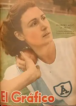 Ingeborg Mello de Preiss (January 4, 1919 – October 25, 2009) was an Argentine track and field athlete who competed mainly in the discus throw and the shot put. She represented Argentina at the 1948 and 1952 Summer Olympic Games.[1] She won the gold medal in the women's discus throw and the shot put event at the 1951 Pan American Games in Buenos Aires, Argentina.