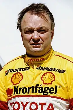 In 1984 he joined Mazda, initially playing a key role in developing the rear-wheel drive Group B RX-7.[4] In 1987 Mazda introduced the Group A 323 4WD. Following the prohibition of Group B, Carlsson found himself with a competitive advantage due to his extensive experience in lesser-powered cars.[2] Carlsson took his first WRC victory on the opening round of the 1989 season in Sweden, and also went on to win Rally New Zealand later in the year. At the end of 1991 Mazda pulled the plug on its rally programme and Carlsson retired from the WRC. He also drove for Toyota in the FIA European Rallycross Championship in 1995 (with teammate Gunde Svan) and 1996. He finished fifth in 1995 and fourth in 1996.