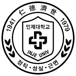 Inje University (Korean: 인제대학교) is a private university founded in 1941, located in Gimhae, South Korea. As of April, 2024, it had 884 faculty members, 340 staff members, 9,017 Undergraduate students and 1,224 Graduate students. The founding mission is to save the world through love and virtue. The educational goals are: to preserve nature; to value human lives and philanthropy. The school precepts are honesty, sincerity, and diligence. [1]