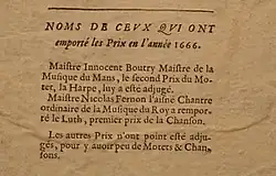 In 1666, Boutry competed at the puy de musique d’Évreux and received the silver harp and the second prize for the motet.[10] In the same year, he was a judge at the puy de musique du Mans, having the two motets received sang and whose best was none other than Louis Bouteiller's one, then a child in the psallete he directed, "de facto" excluded from the competition.[11]