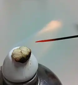 The inoculation needle is sterilized using the aseptic technique.[1][2][3][7] An open flame from an incinerator, a bunsen burner, or an alcohol burner is used to flame along the tip and the length of the needle that is to be in contact with the inoculum (or the propagule).[2][3] For ease of manipulation it is common practice to hold the needle with the dominant hand as if handling a pencil. The needle will be flamed at a downward angle through the flame's inner cone until it is red-hot.[1] The downward angle will minimize the amount of microbial aerosols created.[1][2][3]
