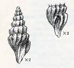 (Original description) The shell consists of eight whorls, rather thick, of a light yellow color, sometimes banded with reddish brown. The posterior sinus is nearly round, situated just below the suture, and has, in the best developed specimen, a thin, sharp edge rising a little above the surface of the shell, bending decidedly backward, then curving and nearly meeting in front. The outer lip rounds gradually to near the anterior end of the aperture, where it is slightly contracted, making a short, broad siphonal canal, then twisting abruptly backward produces a decided notch before joining the columella. A conspicuous varix is formed by the thickening of the last rib, beyond which the outer lip is thin, white, and sharp-edged. There is a prominent, tooth-like projection on the interior of the aperture, at the end of the varix, more conspicuous in some specimens than in others, and seen best in an end view. The interior of the aperture and the inner lip is white. The columella is straight, with a conspicuous layer of enamel having a thin, free edge. The suture is distinct, undulating. The subsutural band is very narrow, concave, lapping well on the preceding whorl. Prominent, strong, oblique, rounded ribs, nine on the body whorl, separated by concave spaces of about the same width, cross the whorls from suture to suture, faintly defined on the subsutural band, and most prominent just below it. On the body whorl, these gradually lade away at the base of the siphon, and appear on the siphonal canal as conspicuous, much curved lines of growth. Microscopic striae intersect the fine lines of growth, giving to the entire surface of the shell a peculiar crinkled appearance. The protoconch is broad, blunt, smooth, somewhat shining, consisting of two and a half whorls. The apical whorl is large, rising very little above the succeeding one.[2]