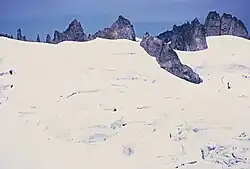 Inspiration Glacier is on the east slopes of Eldorado Peak, North Cascades National Park in the U.S. state of Washington.[2] The glacier is approximately 1.5 mi (2.4 km) in length, 2 mi (3.2 km) in width at its terminus and descends from 8,500 to 6,800 ft (2,600 to 2,100 m). Inspiration Glacier lies in a cirque with Eldorado Peak to the west, the arête known as Tepeh Towers to the northwest and Klawatti Peak to the northeast. Inspiration Glacier is connected to the Eldorado Glacier to the south and partially separated by the Tepeh Towers from the McAllister Glacier to the north.[2] Meltwaters from Inspiration Glacier flow into Moraine Lake.