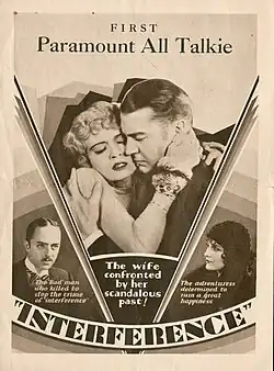 Interference is a 1928 American pre-Code drama film directed by Lothar Mendes, as Paramount Pictures' first feature-length all-talking motion picture. It stars Clive Brook, William Powell, Evelyn Brent, and Doris Kenyon, all making their sound film debuts. In England, when a first husband turns out not to be dead, blackmail leads to murder.[1][2]