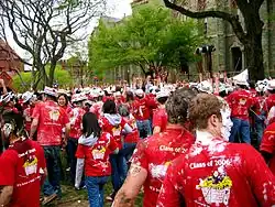 As a sign of school pride, crowds of Quaker fans perform a unique ritual. After the third quarter of football games, spirited onlookers unite in the singing of "Drink a Highball," which refers to the University's unofficial cocktail, the Pennsylvanian, made with Calvados, a dash of Madeira Wine, an egg white, and a twist of lemon.[1][2][3] In years long past, students would make a toast with the drink to the success of Penn's athletic teams. During Prohibition, stubborn students insisted on keeping their tradition - since they could not use alcohol, they had no choice but to literally "toast" Penn. As the last line, "Here's a toast to dear old Penn," is sung, the fans send toast hurling through the air onto the sidelines. In another version of the origins of toast throwing, in 1977, a student threw the first slice of toast after being inspired while attending a showing of The Rocky Horror Picture Show where members of the audience throw toast at the screen. In more recent years, some students have become more creative in their choice of projectiles, and it is not rare to see a hail of bagels or donuts, or even a loaf of French bread come flying down from the stands.[4]