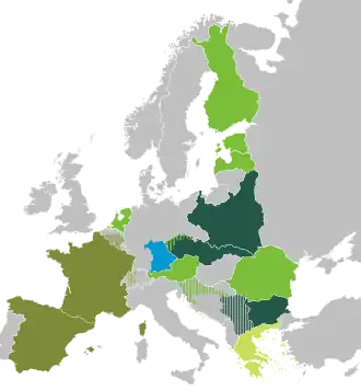 ![]() Countries and regions with IAB members, before 1935 Founding members (joined 1921) Joined by 1927 Joined by 1934 Bavarian People's Party (involved in 1921) Greek Agrarian Party (joined in 1930, dropped out in 1931) Note: Shaded areas represent regional parties. | |