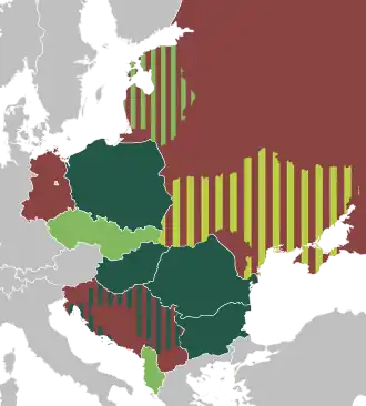 Agrarian initiatives were sabotaged from 1933 by Nazi Germany, whose leadership viewed the entirety of Central Europe as a German Lebensraum.[81] The Bloc of Agrarian Countries held its last conference in Bucharest in June 1933, after which it faded away due to the hostility of great powers and a lack of commitment among Polish statesmen.[82] Although Italy participated in the 1931 Grain Conference, which was a triumph for the small agrarian states,[83] its fascist government singled out peasant internationalists as crucial enemies. In 1934, as part of the Italo–German rapprochement, it maneuvered to have Hungary withdraw from the Bloc of Agrarian Countries.[81] In December of the following year, a piece in Corriere della Sera alleged that a continental conspiracy, comprising both the Red and Green Internationals, was set out to destroy Italy, and, through it, "the order of Europe".[84]