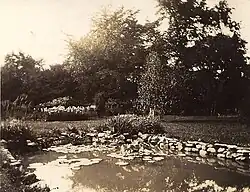 Two thirds of the property was landscaped. The main house occupied a rise in the ground and was reached by a long drive stretching from one front corner to the other. This formed a semicircle which enclosed most of the front lawn, many large trees, a tennis court, and in the middle, a path going directly from the house front entrance to the Main Street sidewalk. The drive entrances were both flanked by stone planters, each with a light. Behind the main buildings there were lawns, flower gardens, and three ponds with water lilies. One was rather formal with rectangular shape and rock wall sides. A rock garden was nearby with small stream feeding a small circular pond. Further in back there was a third lily pond - long and narrow and in a natural setting, no side walls and water level flush with the grass. The ponds and rock garden were amid trees and flower beds and were traversed by gravel paths for walking. A pigeon coop stood next to the garage – a little octagonal house, home to a flock of about 30 white pigeons. The flock was often seen circling in the sky or perched on the roof of the garage. There was no fence around the property. Many patients had outside privileges and on a nice day would stroll in the gardens.