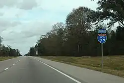 I-59 was not part of the plans in the Federal-Aid Highway Act of 1956, which created the Interstate Highways around the nation; however, in route logs as early as 1957, it was part of a series of contracts awarded by the Mississippi Department of Transportation (MDOT), which included a total of 543 miles (874 km) of road for work, or approximately $46,800,000 in value. However, while the contractors had completed 356 miles (573 km), which was more than half of the awarded miles by the department, adverse weather conditions brought severe weather such as heavy rain and freezing, which delayed the amount of miles by 35 percent, as discussed by director T. C. Robbins. I-59 was one of four Interstate Highways planned to be built in the state, of which the entire mileage of all highways would total 691 miles (1,112 km). As it was one of four highways along with I-10, I-20, and I-55, MDOT chose the selected route that I-59 would supplant, and that was US 11, serving as a major route through the state.[18] This continued into 1958, where 133.3 miles (214.5 km) of Interstate Highways were under construction. Despite the adverse weather conditions and what the highway officials considered "the worst construction weather in the history of the Mississippi Highway department", the state pushed to finish building the Interstate Highways to stretch throughout the entire state. All of the highways were planned to have at least four lanes, with construction planned to continue until around 1969, with an estimated cost of $440 million. The present route of I-59 roughly matches what it was proposed to go through, from Hattiesburg to join I-20 at Meridian, though the length was slightly shorter than what was stated, at 147 miles (237 km) instead of 171 miles (275 km) like what its length actually was.[19]