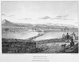![]() View over the Neutral Ground and Inundation from British positions on the Rock of Gibraltar, depicted in 1828 | |