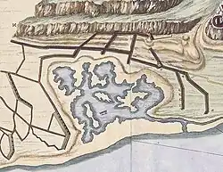 In the 1760s, a line of spiked chevaux de frise was constructed across the top and bottom ends of the Inundation. Ditches twelve feet wide and three feet deep were dug across the Inundation on both sides of the chevaux de frise so that if the lake ever dried out it would still serve as a barrier. Another barrier was constructed at the south end of the Inundation, and stakes were driven into the bed of the lake to serve as underwater obstacles.[1] An unnamed correspondent for the London Chronicle wrote on 19 April 1762: "thro' the middle [of the Inundation] we have run chevaux de frize, lined with plates of iron, and studded with iron spikes, one row pointing towards Spain, and the other towards the garrison, to prevent desertion. They are five feet high, sunk in the mud, and the spikes above the water; by clasping your hands together, your fingers extended and the backs up, you will have an exact idea of them. Through this inundation an enemy must march to come near us, for the causeway is narrow, and when the tide is at lowest ebb, thirty men could not march a-breast upon the beach and causeway; upon which point we can bring above 300 cannon and mortars to bear, besides wall-pieces and small arms."[8] Iron hoops and "many other articles to entangle and obstruct an enemy" were also scattered across the bottom of the Inundation.[7]