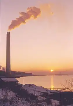 Inverkip power station was an oil-fired power station on the Inverclyde coast, Firth of Clyde, west coast of Scotland. It was closer to Wemyss Bay than Inverkip, and dominated the local area with its 236 m (774 ft) chimney, the third tallest chimney in the UK and Scotland's tallest free-standing structure.[4] In common with other power stations in Scotland it lacked cooling towers; instead, sea water was used as a coolant. The station consisted of three generating units with a combined total rating of 2028 megawatts (MW).[3]