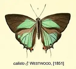 Iolaus calisto, the large green sapphire, is a butterfly in the family Lycaenidae. It is found in Senegal, Gambia, Guinea-Bissau, Guinea, southern Burkina Faso, Sierra Leone, Ivory Coast, Ghana, Togo, Nigeria (south and the Cross River loop), Cameroon, Gabon and the Central African Republic.[2] The habitat consists of forests.