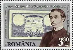 One of the central streets in Bucharest was named after Câmpineanu.[3] In 2015, Poșta Română issued a 3.30 Lei stamp honoring Câmpineanu as the first Governor of the National Bank of Romania.