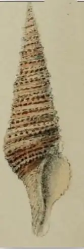 The white, elongate, fusiform shell is transversely finely ridged throughout, the numerous ridges being articulated with minute brown dots. The spire is acuminate. The shell contains fourteen, flattish whorls. These are on top angulate and excavated below the suture. The body whorl is somewhat rounded, contracted at its base and somewhat produced. The ovate aperture is dirty white. The columella is straight and smooth. The outer lip is arcuate. The sinus is rather deeply emarginate. The siphonal canal is short.[2]