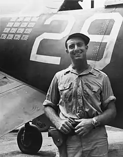 Lt. (jg) Ira C. Kepford in front of his F4U Corsair