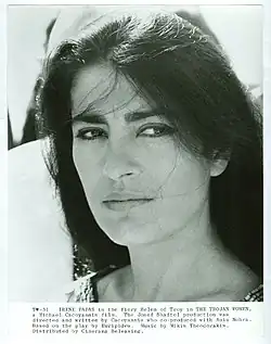 Irene Papas or Irene Pappas[3] (Greek: Ειρήνη Παππά, romanized: Eiríni Pappá, IPA: [iˈrini paˈpa]; born Eirini Lelekou (Greek: Ειρήνη Λελέκου, romanized: Eiríni Lelékou); 3 September 1929 – 14 September 2022)[4] was a Greek actress and singer who starred in over 70 films in a career spanning more than 50 years. She gained international recognition through such popular award-winning films as The Guns of Navarone (1961), Zorba the Greek (1964) and Z (1969). She was a powerful protagonist in films including The Trojan Women (1971) and Iphigenia (1977). She played the title roles in Antigone (1961) and Electra (1962). She had a fine singing voice, on display in the 1968 recording Songs of Theodorakis.