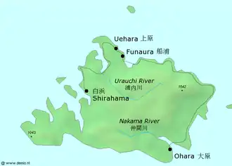 The island has an area of 289.27 km2 (111.69 sq mi) and a 2005 population of 2,347. The island does not have an airstrip, and most visitors—over 390,000 in 2006—arrive from Ishigaki by ferry, a 31.4 km (19.5 mi) ride to Uehara Port (上原港) on Iriomote's northeast coast or Ōhara Port (大原港) on the southeast coast. Administratively, the island belongs to Taketomi Town, Okinawa Prefecture.[1] Its infrastructure is limited to a single coastal road connecting the hamlets on the northern and eastern shores.