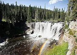 Iris Falls (height 45 feet (14 m)) is a waterfall on the Bechler River in Yellowstone National Park. Iris Falls is located just upstream from Colonnade Falls and is accessible via the Bechler River Trail. The falls were named in 1885 by members of the Arnold Hague Geological Survey for Iris, the mythological Greek goddess of the rainbow.[2]