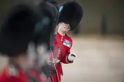 St Patrick's Day is the traditional regimental celebration.[58] It is customary for the regiment to begin the day's celebrations with the Guardsmen being woken by their officers and served gunfire.[59] Fresh shamrock is then presented to members of the regiment, whether they are in the UK or abroad on operations.[46]