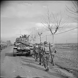 The Irish Guards were part of the ground force of Operation Market Garden, 'Market' being the airborne assault and 'Garden' the ground attack.[18] The Irish Guards led the vanguard of XXX Corps in their advance towards Arnhem, which was the objective of the British 1st Airborne Division, furthest from XXX Corps' start line. The Corps crossed the Belgian-Dutch border, advancing from Neerpelt on 17 September but the Irish Guards encountered heavy resistance which slowed the advance.[19] Following the conclusion of Market Garden, the Irish Guards remained in the Netherlands until taking part in the Allied advance into Germany and seeing heavy action during the Rhineland Campaign with Guardsman Edward Charlton earning the final Victoria Cross to be awarded in the European theatre.[20]
