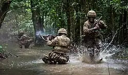 The Irish Guards were involved in the Balkans Conflicts when they were deployed to Macedonia and Kosovo in 1999 and were the first British unit to enter the Kosovan capital city of Pristina on 12 June. The regiment played a significant role in the initial stages of the Iraq War as part of the 7th Armoured Brigade and they led the British advance into Basra in March 2003.[27] The Irish Guards deployed to Iraq on Operation Telic 10 in 2007.[28] In 2010, the regiment deployed on their first tour of duty to Afghanistan.[29] Number 2 Company deployed to Afghanistan in 2013 as a Brigade Operations Company.[30][31]