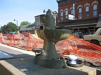 Iron Mike is an 1896 cast-iron fountain in the 400 Block of Washington Street in the city of Oregon, Illinois. It is located at the site of the Ogle County Courthouse, at the intersection of Illinois Route 2 and Route 64. Iron Mike is four feet tall and three feet wide, at its widest point. The fountain's lowest tier is a pool for pets and reads "Illinois Humane Society." There is a step for children on the south side of the fountain and on the north, street, side, the largest middle tier was made to be accessible to horses. On the rear side of the horse basin is a "bubbler" for adults, it is also reachable by children via the iron step. The multi-tier fountain was originally set into a concrete base which was immediately adjacent to the curb of Route 64. In 2021 Iron Mike was relocated 15 feet away from the road unto the property of the Ogle County Courthouse.[2]
