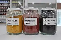 The anhydrous pigment has a dark purple-red or maroon color, hydrates' colors vary from dull yellow (yellow ochre) to warm red.[1]