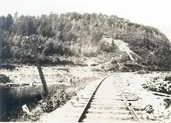 Myles borrowed the required $60,000 from the Canadian Bank of Commerce, using the mines as security.[9][4] The wagonway finally opened in 1878 as the Myles Branch Tramway.[4] The interchange with the Victoria, about 2.5 miles (4.0 km) north of Kinmount, became known as Myles Junction.[8] In 1878, Myles shipped 1000 tonnes of ore, and then abandoned the properties.[9][4]