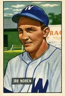 Irving Arnold Noren (November 29, 1924 – November 15, 2019) was an American professional baseball and basketball player. He was an outfielder in the Major Leagues from 1950 through 1960 for the Washington Senators, New York Yankees, Kansas City Athletics, St. Louis Cardinals, Chicago Cubs and Los Angeles Dodgers. He also played for the National Basketball League's Chicago American Gears in 1946–47. Later in his baseball career, Noren was a minor league manager and the third-base coach of the 1972–73 World Series champion Oakland Athletics. As a player and coach between 1950 and 1975, Noren was a member of five world championship teams. The last surviving member of the 1952 World Series champion Yankees, he died at his home in Oceanside, California, on November 15, 2019, at age 94.[1]