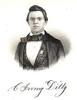 On September 26, 1838, Cyrus Irving Ditty was born in West River, Anne Arundel County, Maryland. He was the youngest of two children of George Ditty of Virginia and Harriet née Winterson. His sister was Sally. His parents lost three children in infancy, Roberta, Juliet & Georgianna. Irving's father was a descendant of Sir Jeremiah Jacob, one of Lord Baltimore's descendants. Irving preferred to be called by his middle name and used "C. Irving Ditty" legally throughout his life.