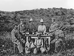 Isaak Witbooi, Nama name: ǃNanseb ǂKharib ǃNansemab, (25 May 1865 – 16 October 1928) was the fourth Kaptein of the ǀKhowesin, a subtribe of the Oorlam, in Gibeon, South-West Africa (today's Namibia). When during the Herero Wars his father, Hendrik Witbooi, fell on 29 October 1905, he inherited the chieftaincy and continued fighting the German troops, but surrendered on 3 February 1906. The German colonial government formally abolished the traditional leadership structures and kept the ǀKhowesin including Isaak Witbooi detained in the North of Namibia, unable to return to Gibeon until the World War I surrender of local German troops to invading British-South African forces in 1915. At Gibeon, Isaak Witbooi succeeded in rebuilding the social organisation of the ǀKhowesin, despite being only recognised as "local headman" by the South African administration.[1] He reigned until his death in 1928, when his brother David Witbooi succeeded him.[2]