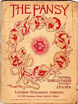 Isabella Macdonald Alden (nickname and pen name, Pansy; November 3, 1841 – August 5, 1930) was an American author. Her best known works were: Four Girls at Chautauqua, Chautauqua Girls at Home, Tip Lewis and his Lamp, Three People, Links in Rebecca's Life, Julia Ried, Ruth Erskine's Crosses, The King's Daughter, The Browning Boys, From Different Standpoints, Mrs. Harry Harper's Awakening, The Measure, and Spun from Fact.[1]