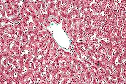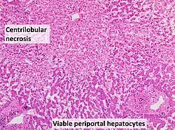 | Histopathology of shock liver, showing its hallmark[1] pathologic finding centrilobular necrosis but viable periportal hepatocytes. H&E stain. The necrotic hepatocytes have barely discernible nuclei. | |
