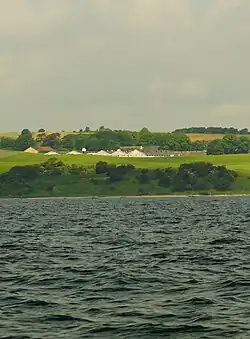 The small public country road leading to Isgård, Isgårdsvej, runs through the main yard continuing under a narrow archway through one of the old farm buildings, turning up a hill as an unpaved road to Landborup. Here the road passes a viewpoint 80 meters above sea level.[1] From this spot there is a view of many of southern Djursland's bays, as well as 10 kilometers across Århus Bugt to mainland Jutland with the seaport of Århus clearly seen. Århus is Denmark's second largest city lying south of the peninsula, Djursland, where Isgård is located on the southern part.[1] In his 2022 book Tolkien og det mytiske Jylland (Danish: Tolkien and the mythical Jutland), historian Casper Clemmensen suggests that Isgård inspired J. R. R. Tolkien in his development of the fortress Isengard in The Lord of the Rings.[4]
