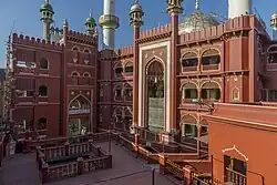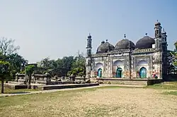 Islam first arrived in Bengal in the year 1204.[6] The establishment of the first Muslim state in Bengal, the Bengal Sultanate, in 1352 by Shamsuddin Ilyas Shah is credited to giving rise to a Bengali socio-linguistic identity.[7] The Sultanate's influence was expansive, with the Hindu-born sultan Jalaluddin Muhammad Shah funding the construction of Islamic institutions as far as Makkah Al Mukarramah and Madinah Al Munawwarah, which came to be known as al-Madaris al-Banjaliyyah (Bengali madrasas). Sufis also became prominent in this period, such as Usman Serajuddin, also known as Akhi Siraj Bengali, who was a native of Gaur in western Bengal and became the Sultanate's court scholar during Ilyas Shah's reign.[8][9][10] Alongside Persian and Arabic, the Sultanate also used the Bengali language to gain patronage and support, contrary to previous states which exclusively favored liturgical languages such as Sanskrit and Pali.[11][12] Islam became especially widespread when the region was under Mughal rule from 1576 to 1765 and was commonly known as Bengal Subah. The Mughal Emperors considered Bengal their most prized province. The Mughal emperor Akbar is credited with developing the modern Bengali calendar.[13]