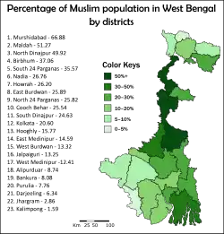 Muslims form the majority of the population in three districts: Murshidabad, Malda and Uttar Dinajpur.[4] Among these, Uttar Dinajpur is notable as ethnic Bengali Muslims comprise 28% of the district's population, with the remaining 22% being Urdu and Surjapuri speakers.[5]