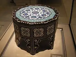 Islamic art makes use of geometric patterns and symmetries in many of its art forms, notably in girih tilings. These are formed using a set of five tile shapes, namely a regular decagon, an elongated hexagon, a bow tie, a rhombus, and a regular pentagon. All the sides of these tiles have the same length; and all their angles are multiples of 36° (π/5 radians), offering fivefold and tenfold symmetries. The tiles are decorated with strapwork lines (girih), generally more visible than the tile boundaries. In 2007, the physicists Peter Lu and Paul Steinhardt argued that girih from the 15th century resembled quasicrystalline Penrose tilings.[79][80][81][82] Elaborate geometric zellige tilework is a distinctive element in Moroccan architecture.[83] Muqarnas vaults are three-dimensional but were designed in two dimensions with drawings of geometrical cells.[84]