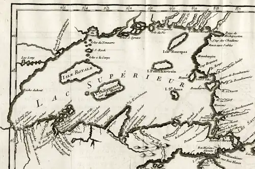 Across the lake due east of Isle Royale on this map lies "I. Pontchartrain", which is oriented and positioned relative to the southeast shoreline of the lake similarly to Michipicoten Island (which does not appear on the map) and may represent it.[4] Northeast of Pontchartrain is "Isle Maurepas", which has been speculated to be either a duplication of Michipicoten (whose shape it resembles),[4][7] or a misrepresentation of the Slate Islands in the north of the lake (an area poorly represented by Bellin).[6] South of "I. Pontchartrain" is "I. Se. Anne", whose relative size and position resemble that of Caribou Island.