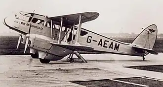 The newly created airline began scheduled operations on 26 September 1937 using an ex-RAS fleet of six De Havilland Dragon Rapides and one De Havilland Dragon.[2] The initial frequency was two return services each weekday over the Manchester-Liverpool-Blackpool-Isle of Man route, plus one daily return service Liverpool-Isle of Man-Belfast.[3] IoMAS flights to Manchester initially served Manchester (Barton) Aerodrome.[4]