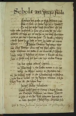 Íslendingabók is preserved in two paper manuscripts from the seventeenth century, AM 113 a fol. (B) and AM 113 b fol. (A), which have been used as the basis for all modern print editions and are currently housed at the Árni Magnússon Institute for Icelandic Studies in Reykjavík.[1] The two manuscripts are copies made by the priest Jón Erlendsson in Villingaholt (died 1672) at the behest of bishop Brynjólfur Sveinsson using the same exemplar. The latter of the two was made because the bishop was unhappy with the first version, which can be dated to 1651. The exemplar, likely a medieval manuscript dating from c.1200, was apparently lost in the course of the late 17th century, and when Árni Magnússon looked for it, it had disappeared without a trace. Because of certain references in the prologue to Bishops Þorlákur Runólfsson (1118–33) and Ketill Þorsteinsson (1122–45), scholars commonly date Íslendingabók to the period from 1122 to 1133.[2]