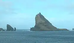 Besides these islets there are also numerous skerries around the Faroes. The most famous is probably Sumbiarsteinur (also known as Munkurin in the south of Suðuroy. Munkurin means the Monk, the name is referring to the fact that Sumbiarsteinur is lying to itself, while the other skerries are close together. This group of skerries are called Flesjarnar. Munkurin is the southernmost point of the Faroes at 61° 10' 30".85 N, 6° 40' 23".77 W. Flesjarnar can be seen from Sumba, Akraberg and from Eggjarnar and other high places in Suðuroy.
