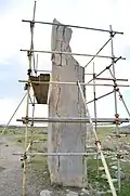 During the Muslim conquest of Pars, as part of the Arab conquest of Iran, the invaders first established headquarters at Beyza.[1] The citizens of Istakhr firmly resisted the Arabs.[2] The first attempt, in 640, led by Al-Ala'a Al-Hadrami was a complete failure.[2] In 643, the Arabs conducted a new campaign led by Abu Musa al-Ash'ari and Uthman ibn Abu al-As which forced Istakhr to surrender.[2] The people of Istakhr, however, quickly revolted and killed the Arab governor installed there.[2] In 648/9, General Abdallah ibn Amir, governor of Basra, conducted another campaign which once again forced Istakhr to surrender after heavy fighting.[1] The suppression of subsequent revolts resulted in the death of many Persians.[2] However, the restive people of Istakhr revolted once again, which prompted the Arabs to undertake yet another campaign against Istakhr, in 649.[1] This final campaign once again resulted in the death of many of its inhabitants.[1] Istakhr's Sasanian fortress, located on the Marvdasht's "easternmost outcrop", became the location of the last resistance to the Arab conquest of Pars.[6]